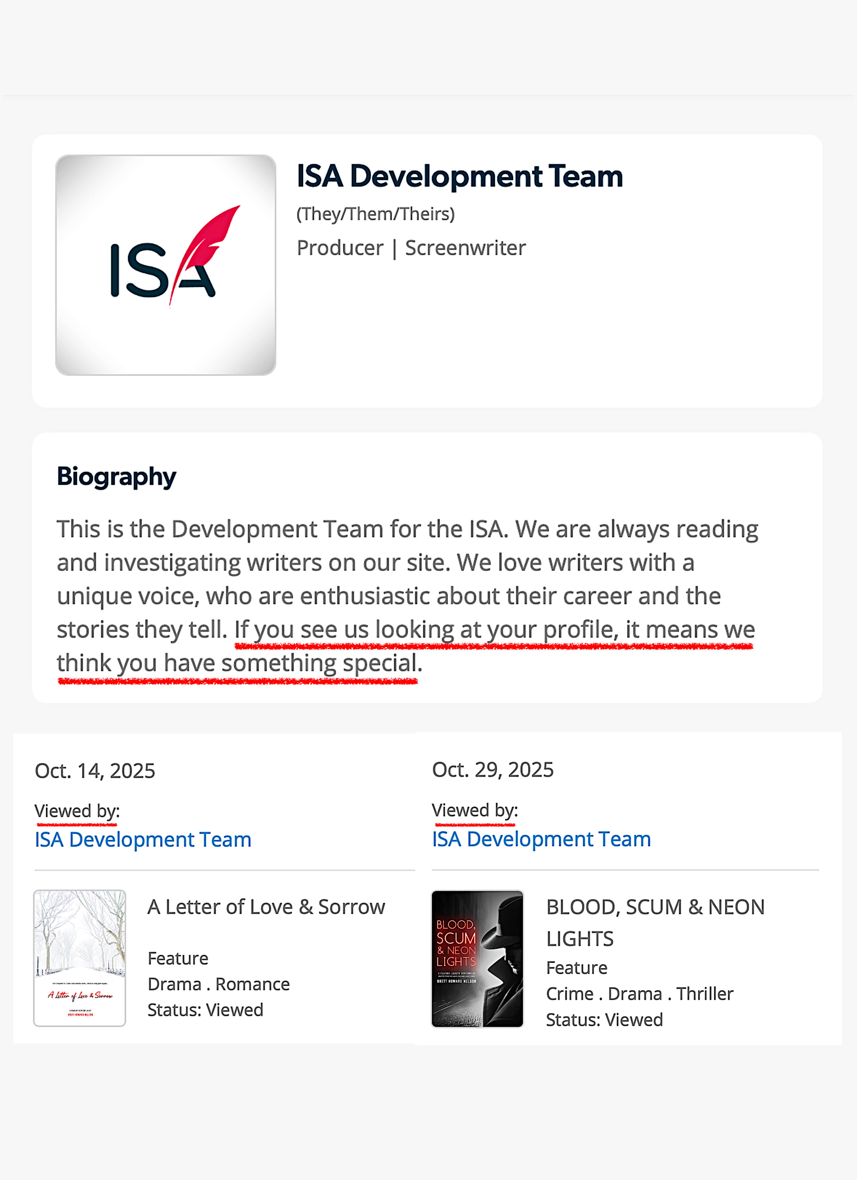 Screenplays & pitch inquiries welcome! All handled directly and in confidence.